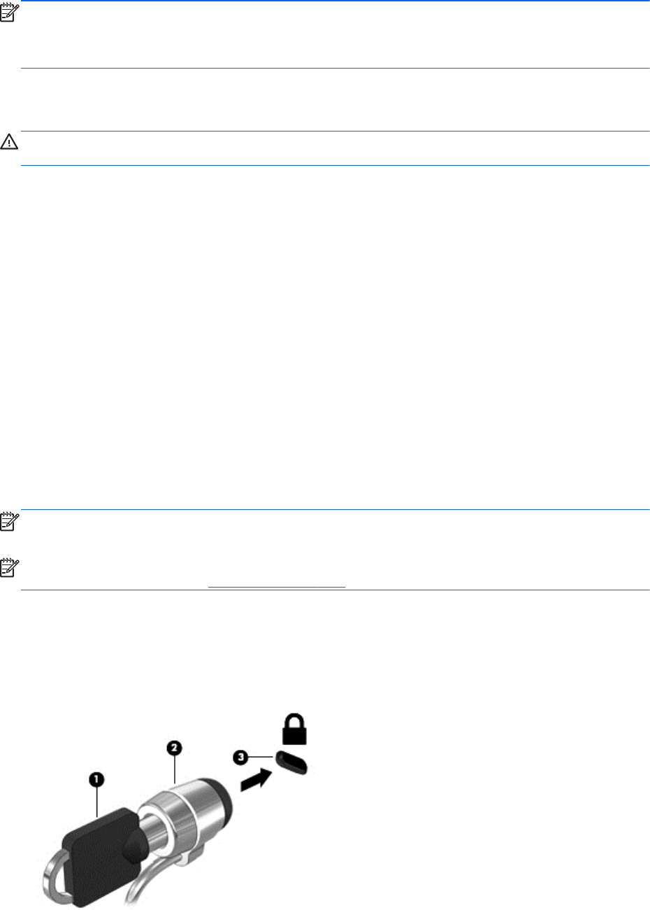 3. 케이블 잠금 장치를 컴퓨터의 보안 케이블 슬롯 (3)에 꽂은 다음 키를 사용하여 케이블 잠금 장치