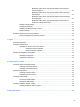 Kazalo A administratorska lozinka za BIOS stvaranje 54 unos 54 upravljanje 54 akcijske tipke glasnoća 27 antene bežičnih uređaja, prepoznavanje 11 audiofunkcije, provjeravanje 28 audioznačajke 27 B baterija napajanje 33 niske razine napunjenosti baterije 36 odlaganje u otpad 38 pohranjivanje 37 punjenje 35 štednja energije 37 temperatura 37 uklanjanje 33 umetanje 33 vijek trajanja 36 bežična mreža (WLAN) 18 javna WLAN veza 16 korporacijska WLAN veza 16 opis 14 potrebna oprema 17 povezivanje 16 sigurnost 18