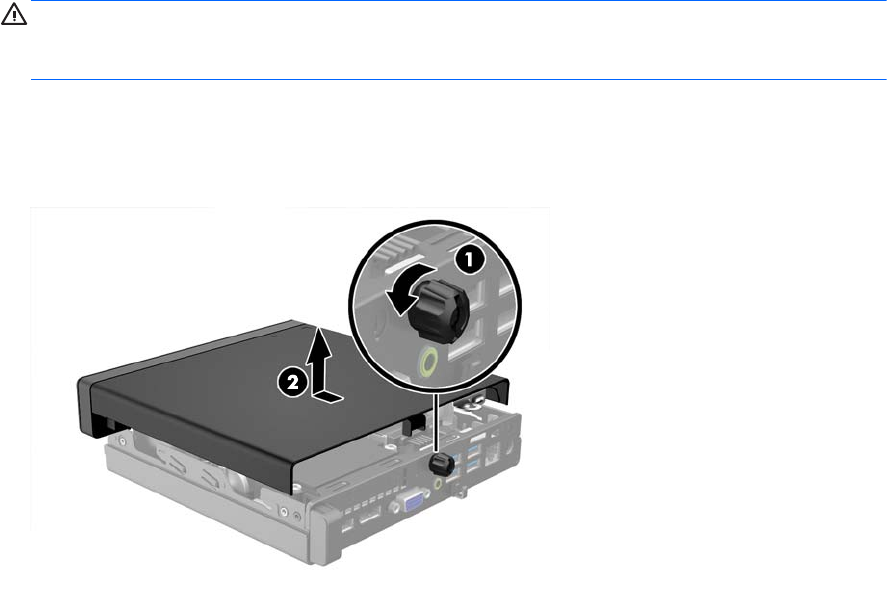 6. Послабте гвинт-баранчик на задній панелі комп’ютера (1), зсуньте панель доступу вперед, потім