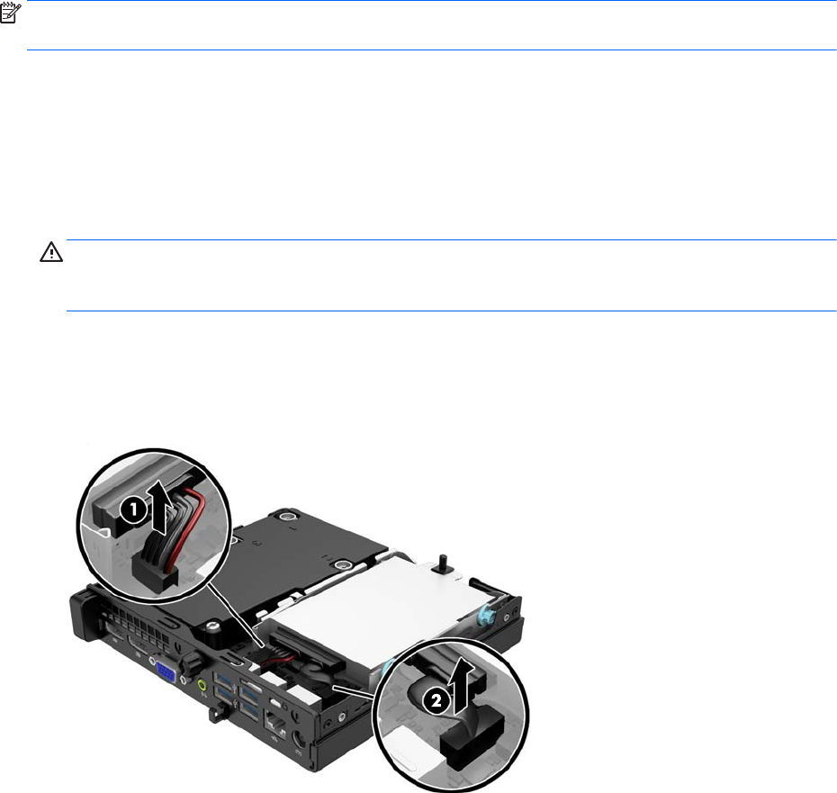 7. Від'єднайте кабель живлення жорсткого диска (1) та кабель даних (2) від системної плати.