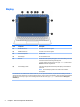 TouchPad Item Component Description (1) Touchpad zone Reads your finger gestures to move the pointer or activate items on the screen. NOTE: The TouchPad also supports edgeswipe gestures. 8 (2) Left TouchPad button Functions like the left button on an external mouse. (3) Right TouchPad button Functions like the right button on an external mouse.