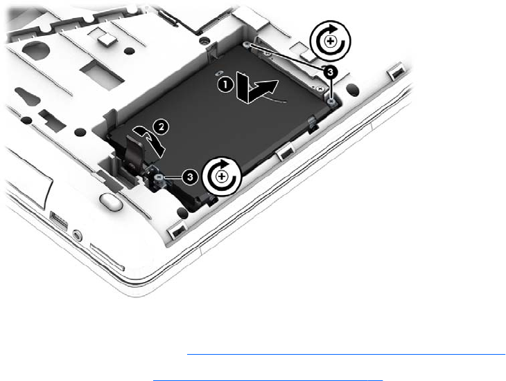 1. Vinkla hårddisken (1) och sänk ned den på hårddiskplatsen.