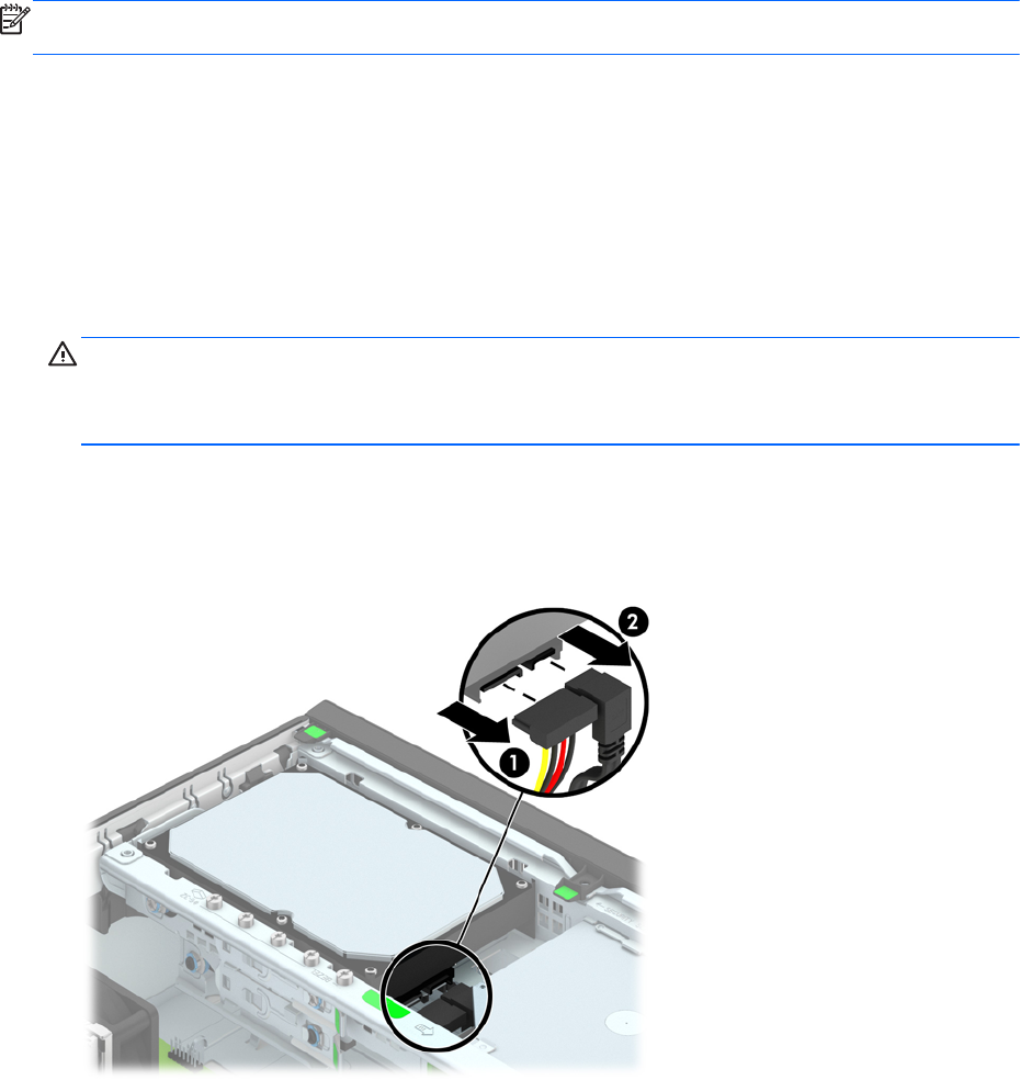7. Отключите кабель питания (1) и кабель данных (2) от тыльной стороны жесткого диска.