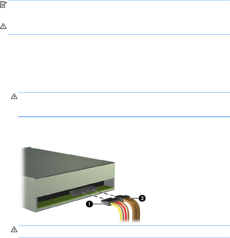 6. Отсоедините от задней панели дисковода кабель питания (1) и кабель данных (2).