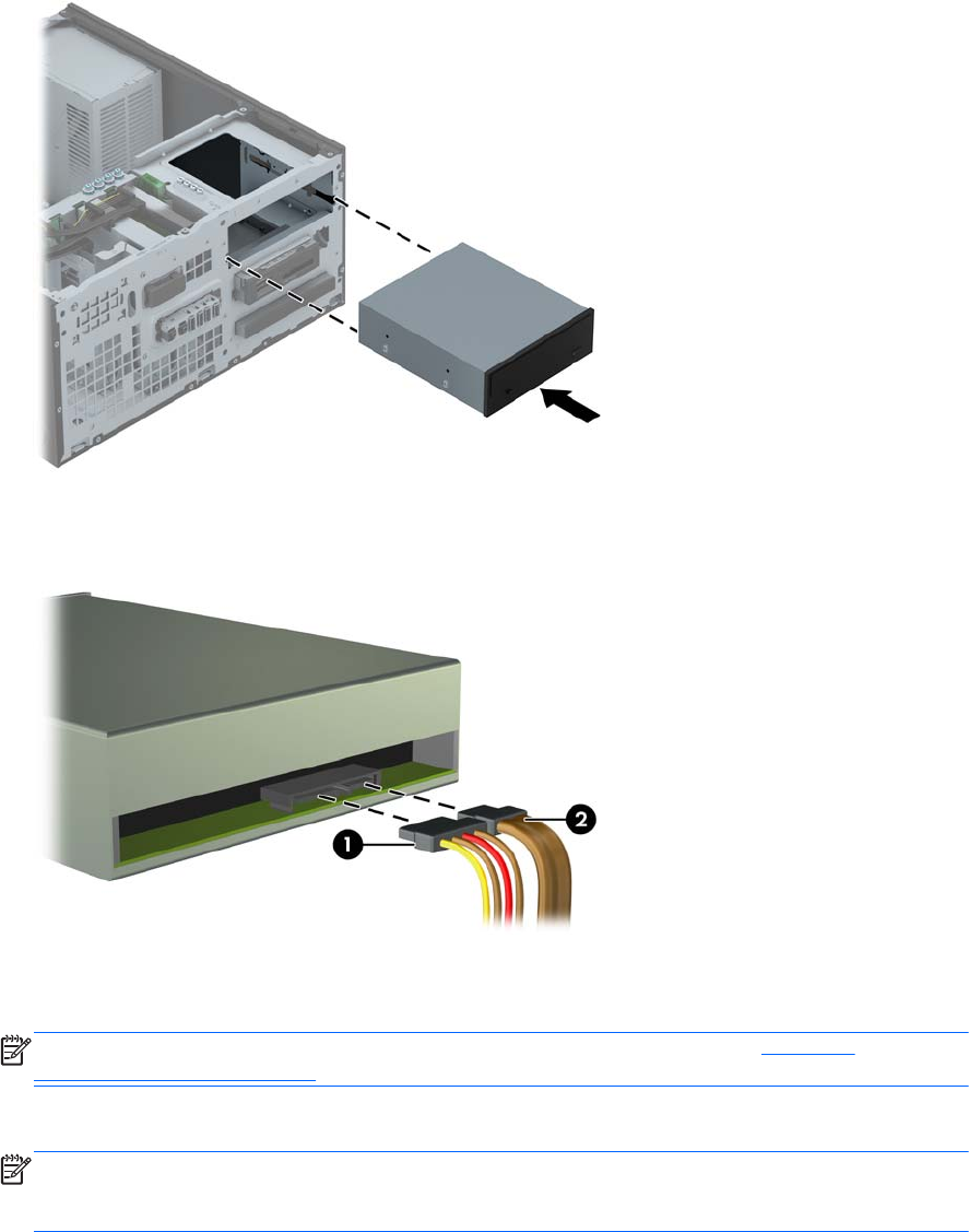 9. Присоедините к задней панели оптического дисковода кабель питания (1) и кабель данных