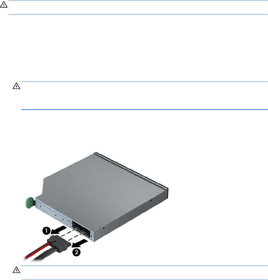 6. Отсоедините от задней панели дисковода кабель питания (1) и кабель данных (2).