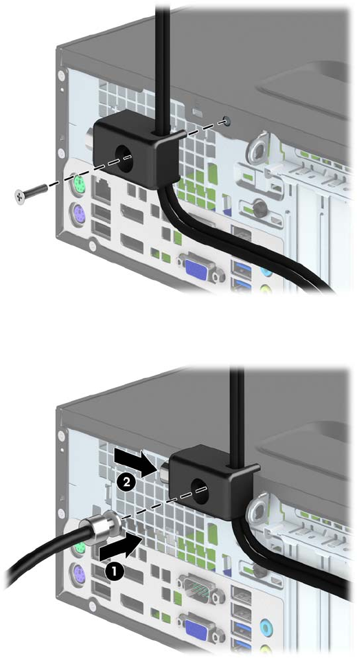 7. Güvenlik kablosunun priz ucunu kilide yerleştirin (1) ve kilidi takmak için düğmeye basın (2).
