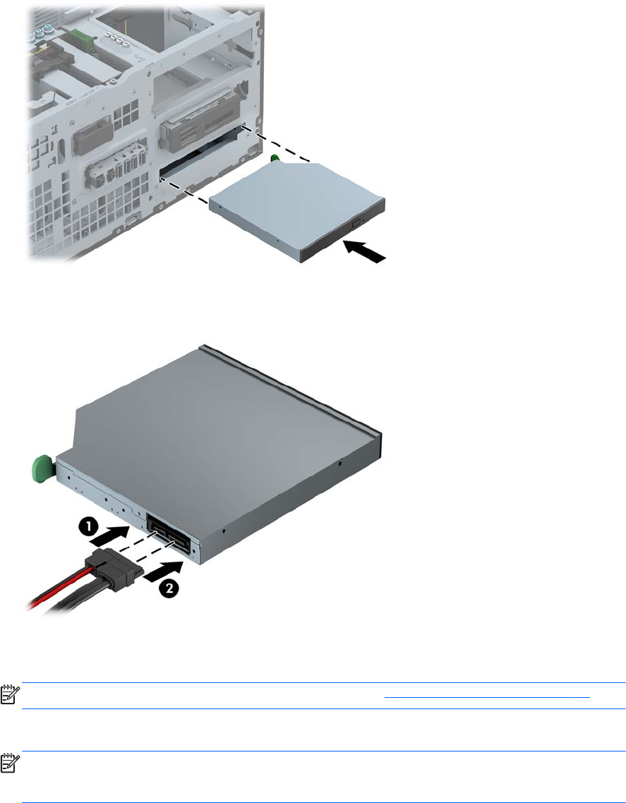 9. Güç (1) ve veri (2) kablolarını optik sürücünün arkasına takın.