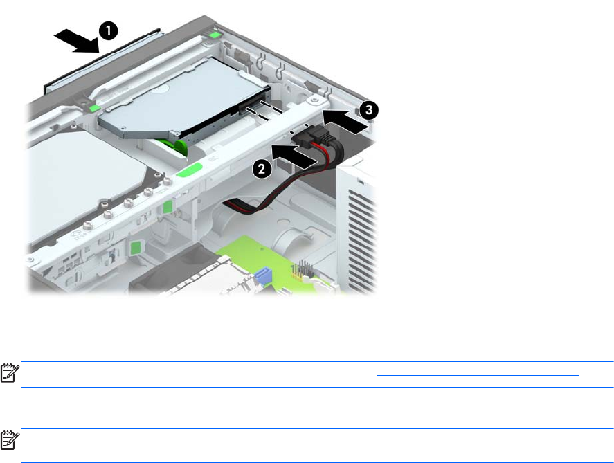 9. Optik sürücüyü ön çerçeveden geçirip yerine oturana kadar yuvasının içine doğru kaydırın (1),