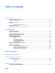 Table of contents 1 Product Features Standard Configuration Features ......................................................................................................... 1 Front Panel Components ..................................................................................................................... 2 Rear Panel Components ...................................................................................................................... 3 Keyboard .......................................