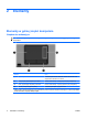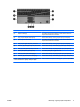 2 Elementy Elementy w górnej części komputera Urządzenia wskazujące UWAGA: Należy korzystać z ilustracji, która najdokładniej odzwierciedla wygląd posiadanego komputera. Element Opis (1) Płytka dotykowa TouchPad Umożliwia przesuwanie wskaźnika, a także zaznaczanie oraz aktywowanie elementów na ekranie. (2) Lewy przycisk płytki dotykowej TouchPad Pełni te same funkcje, co lewy przycisk myszy zewnętrznej.