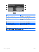 名称 説明 (6) プレゼンテーション ランプ 点灯: プレゼンテーション機能がオンになっています (7) Caps Lock ランプ 点灯: Caps Lock がオンの状態です (8) Num Lock ランプ 点灯: Num Lock がオンであるか、内蔵テンキーが有効な状態で す (9) ミュート ランプ ● 消灯: コンピュータのサウンドがオンになっている状態で す ● 点灯: コンピュータのサウンドが消音(ミュート)されて いる状態です (10) 音量下げランプ 点滅: 音量スクロール ゾーンを使用してスピーカの音量を下げ ている状態です (11) 音量上げランプ 点滅: 音量スクロール ゾーンを使用してスピーカの音量を上げ ている状態です *電源ランプは 2 つあり、両方とも同じ情報を通知します。電源ボタンのところにある電源ランプはコンピュータを開いてい るときにのみ見えます。コンピュータの前面にある電源ランプは、コンピュータを開いているときも閉じているときも見え ます。 †無線ランプは 2 つあり、両方とも同じ情報を通知します。 無線ボタンのところ