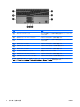 名称 説明 (6) プレゼンテーション ランプ 点灯: プレゼンテーション機能がオンになっています (7) Caps Lock ランプ 点灯: Caps Lock がオンの状態です (8) Num Lock ランプ 点灯: Num Lock がオンであるか、内蔵テンキーが有効な状態で す (9) ミュート ランプ ● 消灯: コンピュータのサウンドがオンになっている状態で す ● 点灯: コンピュータのサウンドが消音(ミュート)されて いる状態です (10) 音量下げランプ 点滅: 音量スクロール ゾーンを使用してスピーカの音量を下げ ている状態です (11) 音量上げランプ 点滅: 音量スクロール ゾーンを使用してスピーカの音量を上げ ている状態です *電源ランプは 2 つあり、両方とも同じ情報を通知します。電源ボタンのところにある電源ランプはコンピュータを開いてい るときにのみ見えます。コンピュータの前面にある電源ランプは、コンピュータを開いているときも閉じているときも見え ます。 †無線ランプは 2 つあり、両方とも同じ情報を通知します。 無線ボタンのところ