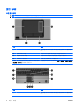 앞면 부품 부품 (1) (2) (3) (4) KOWW 설명 무선 표시등 전원 표시등 배터리 표시등 드라이브 표시등 ● 켜짐: WLAN(무선 근거리 통신망) 장치, HP 광대역 무선 모듈 및/또는 Bluetooth 장치와 같은 내장 무선 장치가 켜져 있습니 다. ● 꺼짐: 모든 무선 장치가 꺼져 있습니다. ● 켜짐: 컴퓨터가 켜져 있습니다. ● 깜박임: 컴퓨터가 대기 모드 상태입니다. ● 빠르게 깜박임: 출력 전압이 더 높은 AC 어댑터를 연결해야 합니다. ● 꺼짐: 컴퓨터가 꺼져 있거나 최대 절전 모드 상태입니다. ● 황색: 배터리를 충전하는 중입니다. ● 녹색: 배터리가 거의 다 충전되었습니다. ● 황색으로 깜박임: 유일하게 사용할 수 있는 전원인 배터리의 전원이 부족한 상태에 도달했습니다. 배터리가 위험 상태에 도달하면 배터리 표시등이 빠르게 깜박입니다.