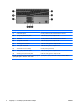 Komponenta Opis (1) Pokazivačka palica Pomiče pokazivač i bira ili aktivira stavke na zaslonu. (2) Lijevi gumb pokazivačke palice Radi kao lijevi gumb na vanjskom mišu. (3) TouchPad Pomiče pokazivač i bira ili aktivira stavke na zaslonu. (4) Lijevi gumb TouchPada Radi kao lijevi gumb na vanjskom mišu. (5) Središnji gumb TouchPada Radi kao srednji gumb na vanjskom mišu. (6) Desni gumb TouchPada Radi kao desni gumb na vanjskom mišu.
