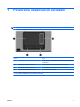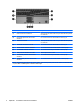 Súčasť Popis (1) Páčkové ukazovacie zariadenie Slúži na posúvanie ukazovateľa a na výber alebo aktiváciu položiek na obrazovke. (2) Ľavé tlačidlo páčkového ukazovacieho zariadenia Plní rovnakú funkciu ako ľavé tlačidlo na externej myši. (3) Zariadenie TouchPad Slúži na posúvanie ukazovateľa a na výber alebo aktiváciu položiek na obrazovke. (4) Ľavé tlačidlo zariadenia TouchPad Plní rovnakú funkciu ako ľavé tlačidlo na externej myši.