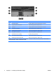 Komponenta Opis (1) Pokazivačka palica Pomiče pokazivač i bira ili aktivira stavke na zaslonu. (2) Lijevi gumb pokazivačke palice Radi kao lijevi gumb na vanjskom mišu. (3) TouchPad Pomiče pokazivač i bira ili aktivira stavke na zaslonu. (4) Lijevi gumb TouchPada Radi kao lijevi gumb na vanjskom mišu. (5) Središnji gumb TouchPada Radi kao srednji gumb na vanjskom mišu. (6) Desni gumb TouchPada Radi kao desni gumb na vanjskom mišu.