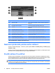 4 Používání klávesnice Počítač je vybaven integrovanou číselnou klávesnicí, podporuje však i připojení externí klávesnice s číselnými klávesami. POZNÁMKA: Váš počítač se může od obrázku v této kapitole mírně lišit. CSWW Komponenta Popis (1) Klávesa fn Stisknutím v kombinaci s funkční klávesou nebo klávesou esc lze vykonat často používané systémové funkce. (2) Integrovaná číselná klávesnice Lze ji používat stejně jako klávesy externí číselné klávesnice.