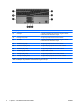 4 A számbillentyűzet használata A számítógép beágyazott számbillentyűzettel van felszerelve, és opcionális külső számbillentyűzettel, illetve számbillentyűzetet magában foglaló opcionális külső billentyűzettel is használható. MEGJEGYZÉS: Az Ön számítógépe kismértékben eltérhet az ábrákon bemutatott számítógépektől. HUWW Részegység Leírás (1) fn billentyű A funkcióbillentyűkkel és az esc billentyűvel együtt lenyomva a gyakran használt rendszerműveletek végrehajtására szolgál.