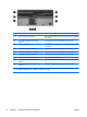 Súčasť Popis (1) Páčkové ukazovacie zariadenie Slúži na posúvanie ukazovateľa a na výber alebo aktiváciu položiek na obrazovke. (2) Ľavé tlačidlo páčkového ukazovacieho zariadenia Plní rovnakú funkciu ako ľavé tlačidlo na externej myši. (3) Zariadenie TouchPad Slúži na posúvanie ukazovateľa a na výber alebo aktiváciu položiek na obrazovke. (4) Ľavé tlačidlo zariadenia TouchPad Plní rovnakú funkciu ako ľavé tlačidlo na externej myši.