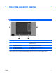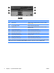 4 Uporaba tipkovnic Računalnik ima vgrajeno številsko tipkovnico in podpira dodatno zunanjo številsko tipkovnico ali dodatno zunanjo tipkovnico s številskim delom. OPOMBA: Računalnik se lahko nekoliko razlikuje od tistega na sliki v tem razdelku. 14 Komponenta Opis (1) Tipka fn Če jo pritisnete v kombinaciji s funkcijsko tipko ali tipko esc, se zaženejo pogosto uporabljene sistemske funkcije. (2) vgrajena številska tipkovnica Lahko uporabljate tako kot tipke na zunanji številčni tipkovnici.
