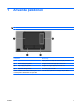 4 Använda tangentbord Datorn har ett inbäddat numeriskt tangentbord och stöder även ett extra externt numeriskt tangentbord eller ett extra externt tangentbord som inkluderar ett numeriskt tangentbord. OBS! Din dator kan se annorlunda ut än den som visas på bilden i det här avsnittet. SVWW Komponent Beskrivning (1) fn-tangent Utför vanliga systemfunktioner när den trycks ned i kombination med en funktionstangent eller esc-tangenten.