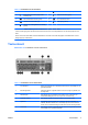 Tabel 1-3 Onderdelen van het toetsenbord (vervolg) 1 4 7 Applicatietoets1 Wordt in Microsoft Office-applicaties gebruikt om popupmenu's te openen (net als de rechtermuisknop). Heeft in andere applicaties mogelijk andere functies. 8 Windows-logotoetsen1 Met deze toetsen opent u het menu Start in Microsoft Windows. Wordt in combinatie met andere toetsen gebruikt voor andere functies. 9 Alt-toetsen Deze toetsen worden in combinatie met een andere toets gebruikt.