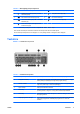 Tabula 1-3 Tastatūras komponenti (turpinājums) 1 4 8 Windows logotipa taustiņi1 Izmanto, lai atvērtu Microsoft Windows izvēlni Start (Sākt). Izmanto kombinācijā ar citiem taustiņiem, lai veiktu citas funkcijas. 9 Alt taustiņi Tiek izmantoti kopā ar citiem taustiņiem; to darbība ir atkarīga no izmantotās lietojumprogrammas. Taustiņi, kas pieejami atsevišķos ģeogrāfiskos reģionos.