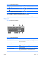 Tabell 1-3 Komponenter på tastaturet (forts.) 1 4 8 Windows-logotaster1 Brukes til å åpne Start-menyen i Microsoft Windows. Brukes i kombinasjon med andre taster til å utføre andre funksjoner. 9 Alt-tastene Brukes i kombinasjon med andre taster. Virkningen er avhengig av hvilken programvare som brukes. Taster tilgjengelige i visse geografiske områder.