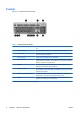 Componentes del panel trasero Figura 1-3 Componentes del Panel Trasero Tabla 1-2 Componentes del panel trasero 1 Conector del cable de alimentación 6 Conector para Monitor VGA (azul) 2 Conector de Interfaz de Video Digital (DVI–D) del Monitor (blanco) 7 Conector de Mouse PS/2 (verde) 3 Conector de Teclado PS/2 (morado) 8 Conector RJ-45 (red) 4 Universal Serial Bus (USB) (6) 9 Conector de Línea de Entrada de Audio (azul) 5 Conector de Línea de Salida para dispositivos de audio con alimentac