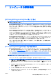 表 2-5 メディア カード リーダーに関するトラブルの解決方法 (続き) メディア カード リーダーを取り付けてから Windows を起動しても、リーダーと、リーダーに挿入したカードがコンピュー タに認識されない 原因 解決方法 コンピュータにリーダーを取り付けた直後に初めてコンピュ ータを起動した場合は、オペレーティング システムがデバイ スを認識するまでに時間がかかる オペレーティング システムがリーダーおよび使用できるポー トを認識し、さらにリーダーに挿入されたメディアを認識で きるようになるまで数秒間待ちます メディア カードをリーダーに挿入すると、コンピュータがメディア カードから起動しようとする JAWW 原因 解決方法 挿入したメディア カードにブート機能がある メディア カードから起動しないようにするには、起動中にメ ディア カードを取り外すか、挿入したメディア カードから起 動するオプションを起動プロセス中に選択しないようにしま す メディア カード リーダーに関するトラブルの解決方法 23