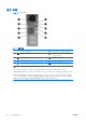 앞면 패널 부품 모델에 따라 드라이브 구성이 다를 수 있습니다. 그림 1-2 앞면 패널 부품 표 1-1 앞면 패널 부품 1 13.34cm 광 드라이브 8 13.34cm 미디어 카드 리더(선택 사양) 2 광 드라이브 작동 표시등 9 디스켓 드라이브 작동 표시등(선택 사양) 3 8.89cm 디스켓 드라이브(선택 사양)1 10 디스켓 꺼내기 버튼(선택 사양) 4 이중 상태 전원 버튼 11 전원 표시등 5 하드 드라이브 작동 표시등 12 헤드폰 연결단자 6 마이크 연결단자 13 USB(범용 직렬 버스) 포트 7 광 드라이브 꺼내기 버튼 주: 광 드라이브에는 DVD-ROM 또는 SuperMulti LightScribe 드라이브가 있습니다. 주의: 맨 아래에 있는 13.34cm 베이는 위에 있는 2 개의 베이보다 길이가 짧습니다. 맨 아래에 있는 베이에는 길이 가 14.5cm 이하인 1/2 높이 드라이브 또는 기타 장치만 설치할 수 있습니다.