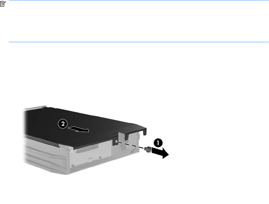 2. Távolítsa el a csavart a tároló hátuljából (1), és csúsztassa le a tároló fedelét (2).