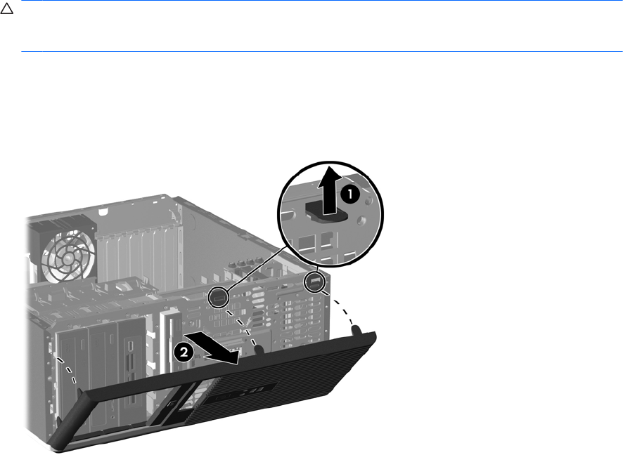 6. Skyv de to utløsningstungene (1) oppover, drei deretter frontpanelet bort fra chassiset for å frigjøre