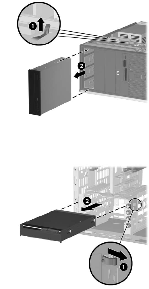 Figur 2-17 Fjerne en 3,5-tommers eller 5,25-tommers stasjon i minitårnkonfigurasjonen