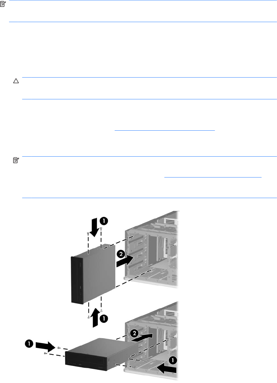 Figur 2-22 Installere en 5,25-tommers stasjon i et minitårn (øverst) og en bordmodell (nederst)