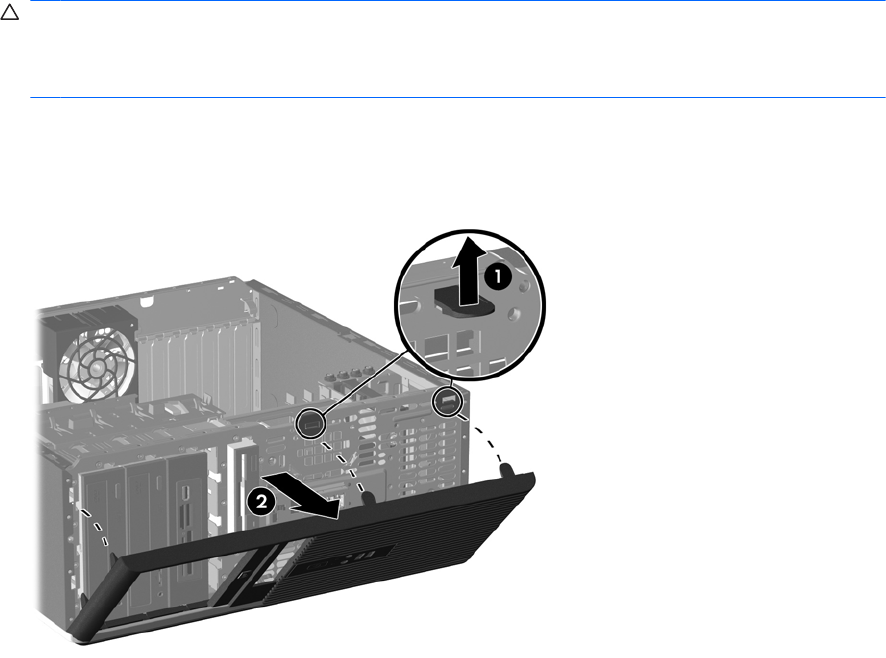 6. Druk de twee ontgrendelingslipjes omhoog (1) en draai vervolgens het voorpaneel naar voren (2).