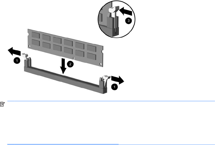 7. Open beide vergrendelingen van het geheugenvoetje (1) en plaats de geheugenmodule in het