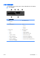 介质卡阅读器组件 介质卡阅读器是仅在某些机型上提供的可选设备。请参阅以下图解和表格来识别介质卡阅读器组件。 图 1-3 介质卡阅读器组件 表 1-2 介质卡阅读器组件 1 2 3 ZHCN SM/xD ● 3.3 伏 SM 卡 ● xD 卡 介质卡阅读器活动指示灯 SD/MMC+/miniSD 4 USB(通用串行总线)端口 5 CF I/II 型 6 ● I 型 CF 卡 ● II 型 CF 卡 ● MicroDrive MS PRO/MS PRO DUO ● SD 卡 ● 记忆棒 (MS) ● MSD 卡 ● MagicGate 记忆棒 (MG) ● MMC 卡 ● MagicGate Memory Duo 记忆棒 ● 小型 MMC 卡 (RS MMC) ● Memory Stick Select 记忆棒 ● MMC 4.0 卡 (Mobile Plus) ● Memory Stick Duo 记忆棒 (MS Duo) ● 小型 MMC 4.
