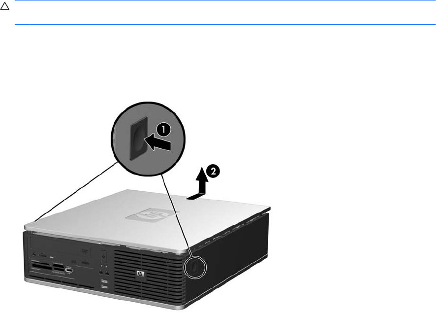 按下计算机左侧和右侧的按钮 (1),然后向后滑动检修面板直到滑不动为止,接着向上提起检修面