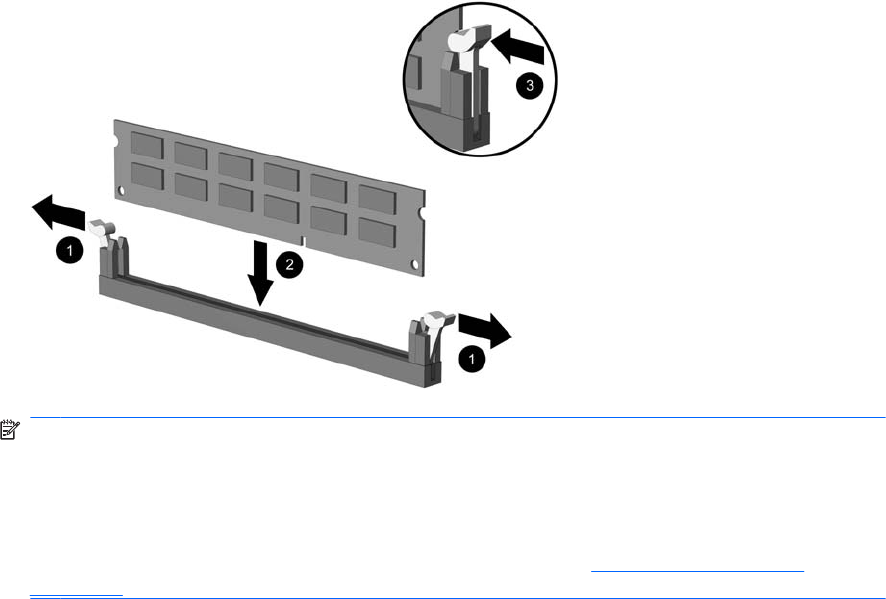 8. Åbn begge låse på stikket til hukommelsesmodulet (1), og sæt modulet i stikket (2).