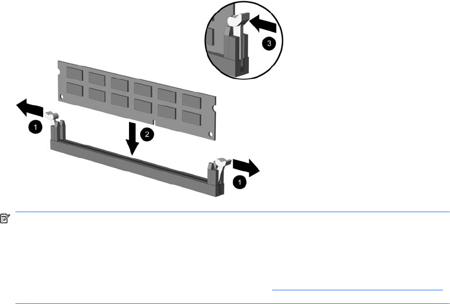 8. Open both latches of the memory module socket (1), and insert the memory module into the socket