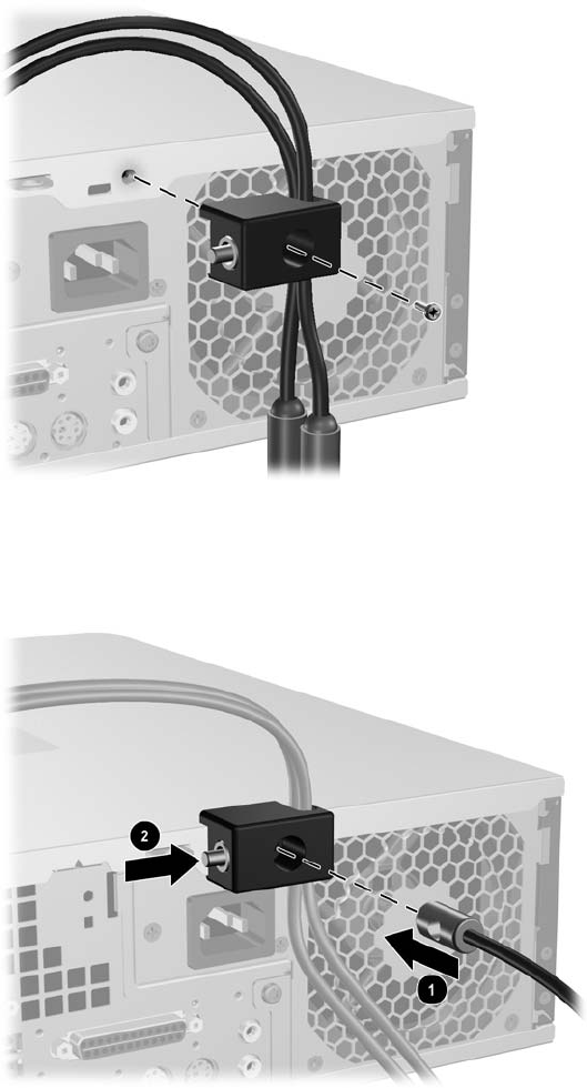 4. Insert the plug end of the security cable into the lock (1) and push the button in (2) to engage the