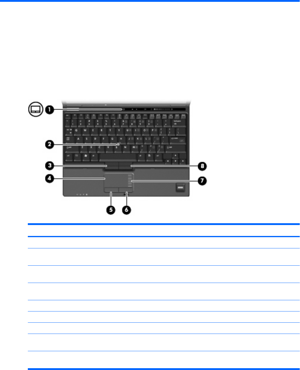 (1) Tlačidlo zapnutia/vypnutia zariadenia TouchPad Slúži na zapnutie a vypnutie zariadenia TouchPad.