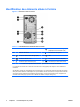 Identification des éléments situés à l'arrière Figure 1-4 Éléments situés à l'arrière Tableau 1-3 Identification des éléments situés à l'arrière 1 Connecteur du cordon d'alimentation 6 Connecteur audio de sortie de ligne pour périphériques audio alimentés (vert) 2 Sélecteur de tension 7 Connecteur de microphone 3 Connecteur audio d'entrée de ligne (bleu) 8 USB 4 Connecteur réseau RJ-45 9 Connecteur du moniteur VGA (bleu) 5 Connecteur pour souris PS/2 (vert) 10 Connecteur pour clavier PS/