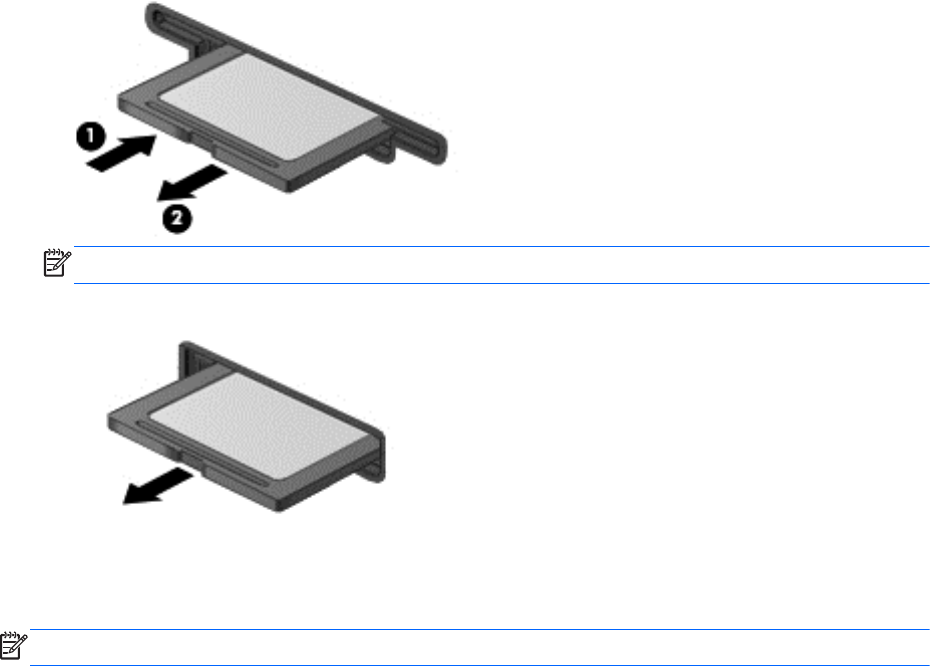 3. 將卡向內壓 (1),然後從插槽取出卡 (2)。