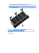 7. Løsn de fire skruer på harddiskdækslet (1). Træk tekstilharddisktappen (2) opad, og fjern