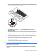 ver el color rojo debajo los pestillos. Usando la pestaña de tela, incline la batería hacia arriba (2)