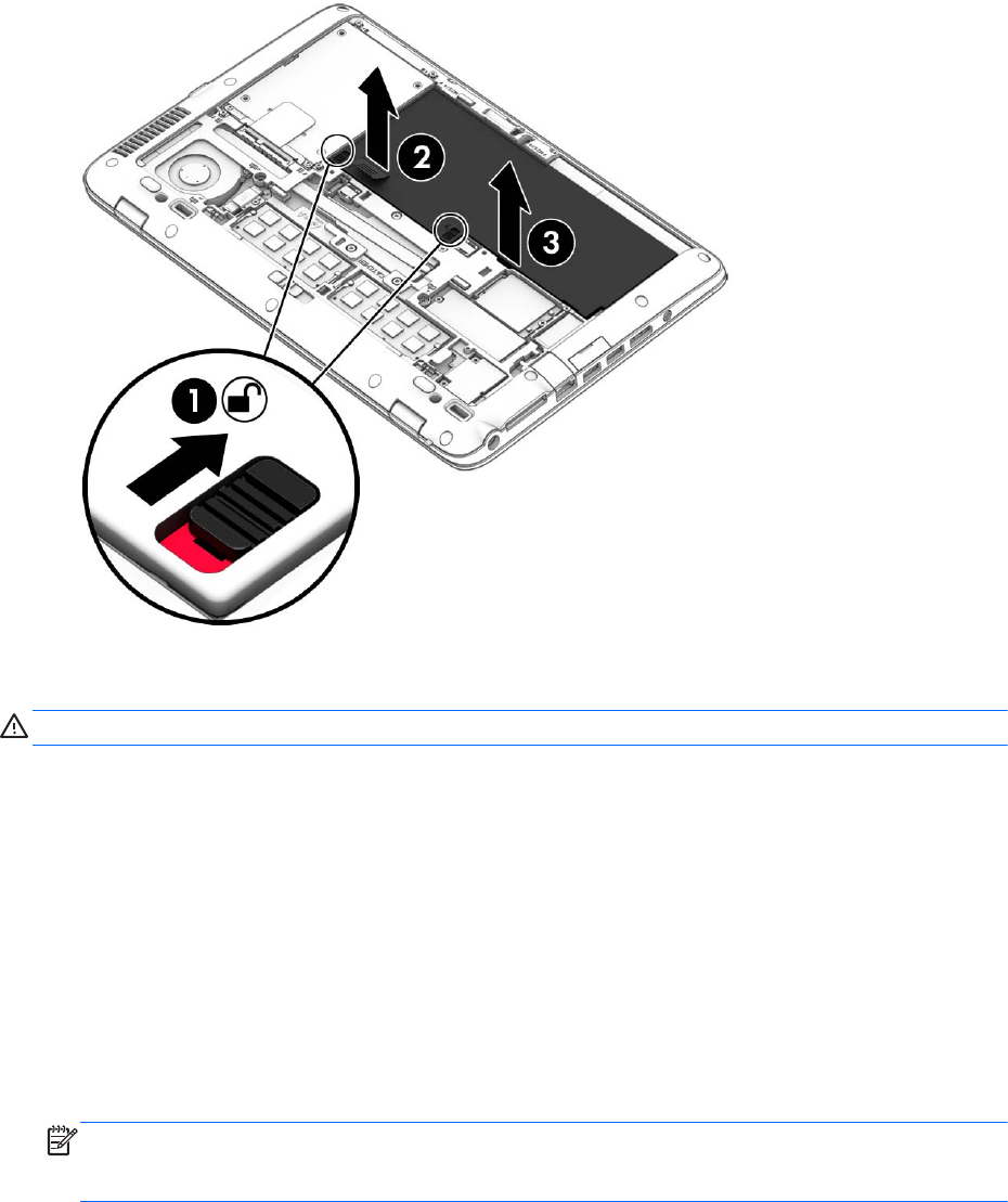 2. Faites glisser les deux loquets de dégagement de la batterie en position de déverrouillage (1).