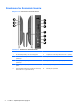 Компоненты боковой панели Рисунок 1-3 Компоненты боковой панели Таблица 1-2 Компоненты боковой панели 4 Компонент Компонент 1 Оптический дисковод с лоточной загрузкой 6 Устройство чтения карт памяти HP «5 в 1» (опция) 2 Кнопка извлечения диска из оптического дисковода 7 Порт USB 3.0 3 Светодиодный индикатор активности оптического дисковода 8 Порт USB 3.